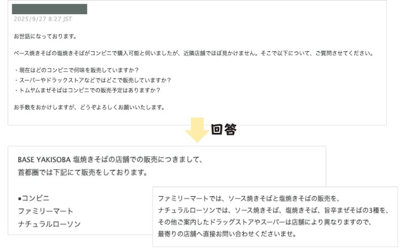 ベース焼きそばは首都圏のファミリーマートナチュラルローソンでしか取り扱いがなく、販売有無は店舗によって異なる旨の回答。また、新商品のトムヤムまぜそばは販売していません。