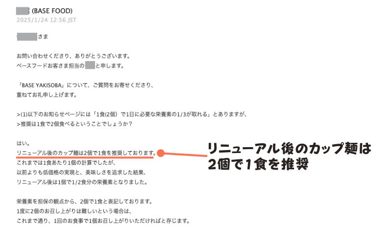 「1食2個」という記載があるので、食べ方を誤解していたのかも。ベースフード社に問い合わせをしてみました。