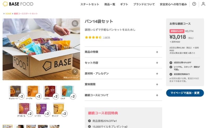 ベースブレッドの特徴や強みなどの紹介、セット内容の説明などが表示されます。ざーっと見ておくのがおすすめです。