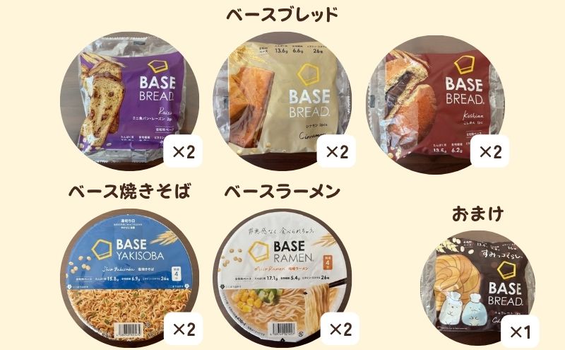 ベースフードには以下の商品があります。おすすめはベースブレッドですが、他の商品も併用することで、飽きずに継続しやすくなります。
