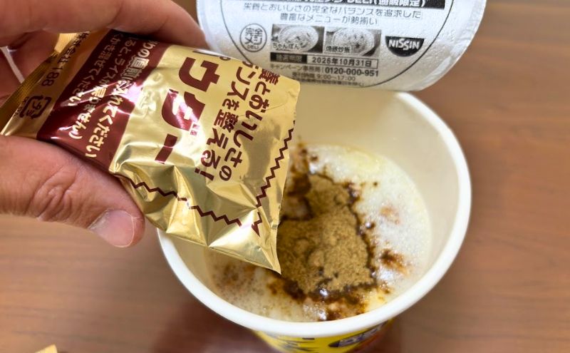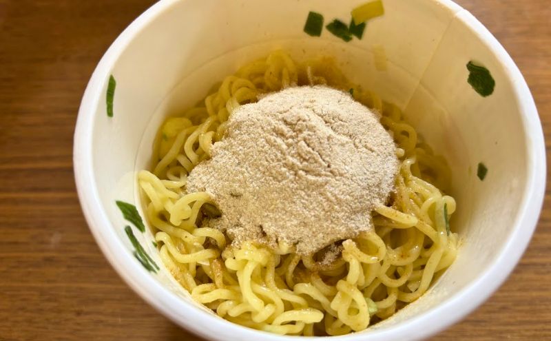 完全メシの汁なしカップヌードルを作るとき、付属の粉末をお湯と一緒に入れます。この粉の量がなかなかすごいです。