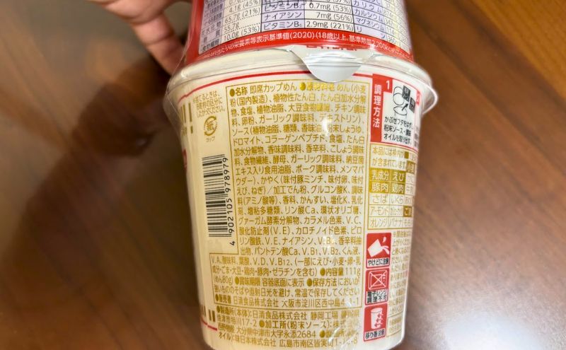 完全メシ汁なしカップヌードルのパッケージ裏面を見ると、添加物の一覧が確認できます。