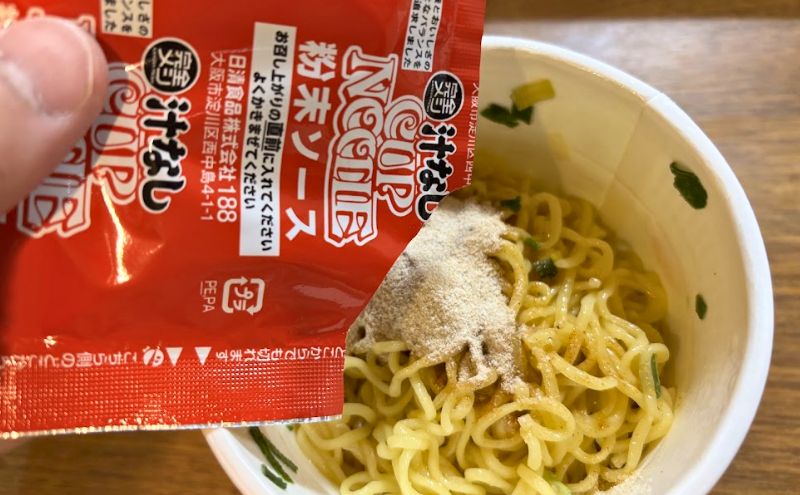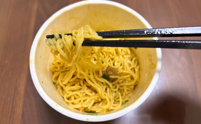 栄養素を添加している粉末の影響か、汁なしカップヌードルより粉末感が強めでした。