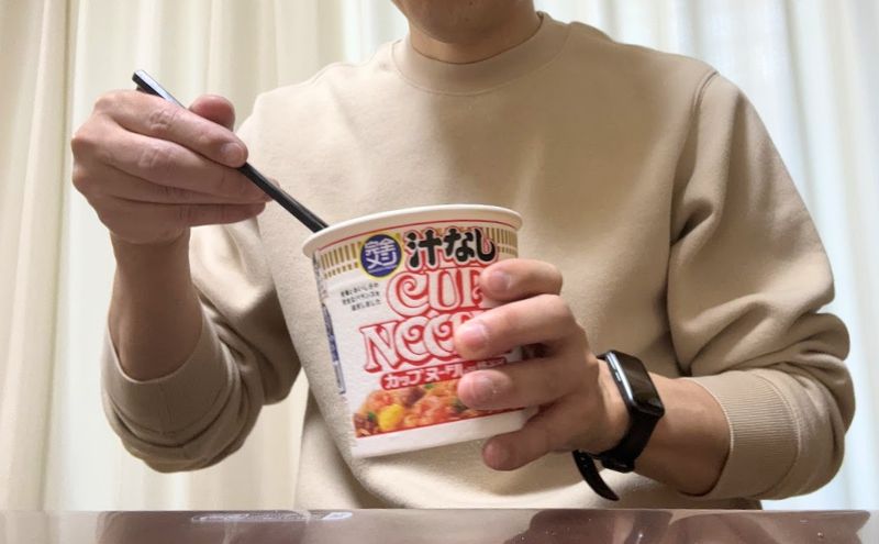 麺やライス系は噛む回数が少なく、満腹感が得にくい傾向があります。実際、自分が食べたときも汁なしカップヌードル・カレーメシともにわりとすぐお腹が空きました。